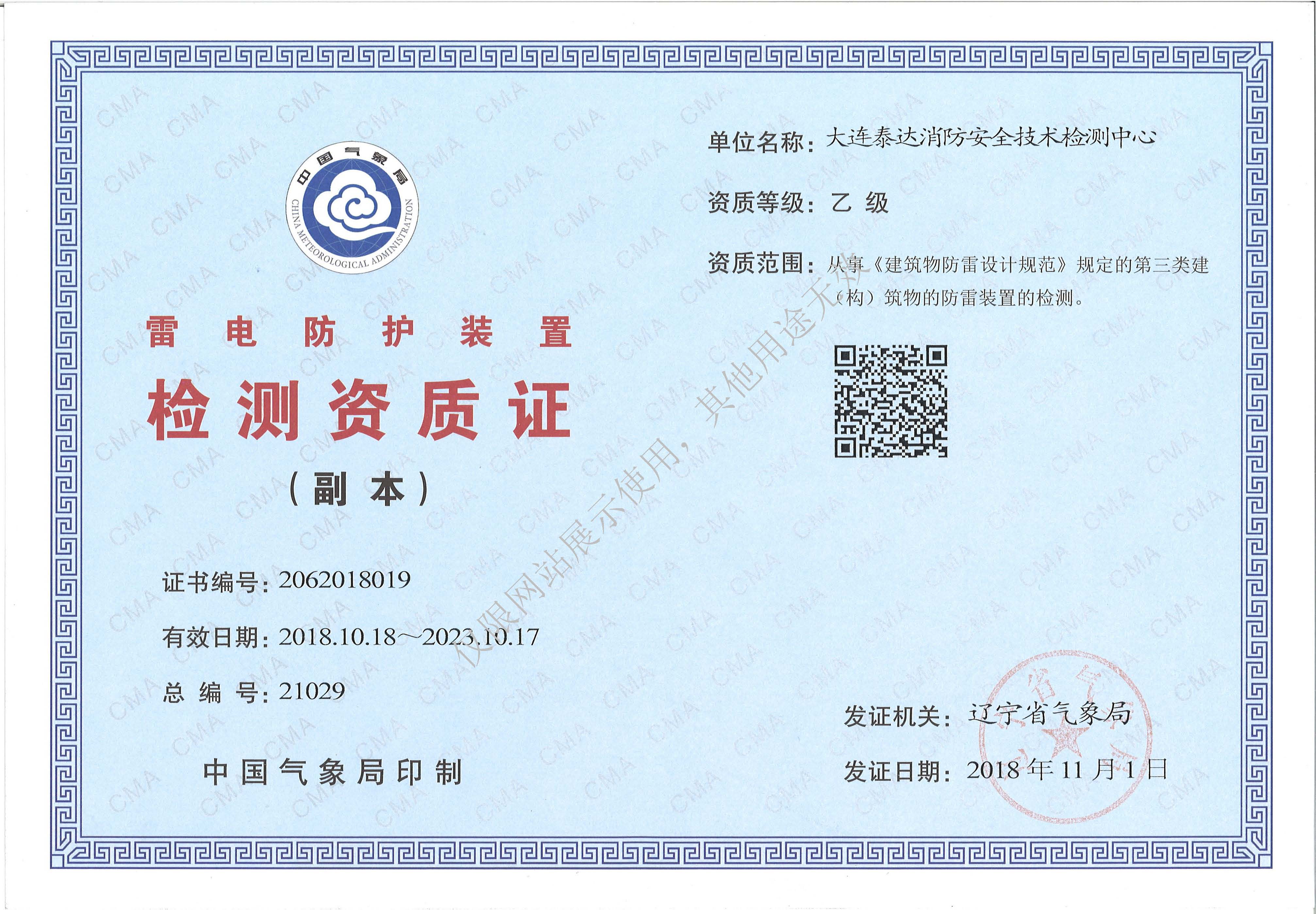 是經“社會消防技術服務信息系統”備案并公示的消防技術服務機構,已取得中國氣象局頒發的雷電防護裝置檢測資質證書、遼寧省質量技術監督局審核批準的檢驗檢測機構資質認定證書(CMA)及包括消防檢測、電氣檢測、雷電防護裝置檢測、防火涂層厚度檢測等在內的200余項檢驗檢測能力,取得大連市應急管理局頒發的安全生產標準化證書,獲得質量管理體系、環境管理體系、職業健康安全管理體系認證證書,是經備案的高新技術企業,可獨立出具具有證明作用的檢測報告。